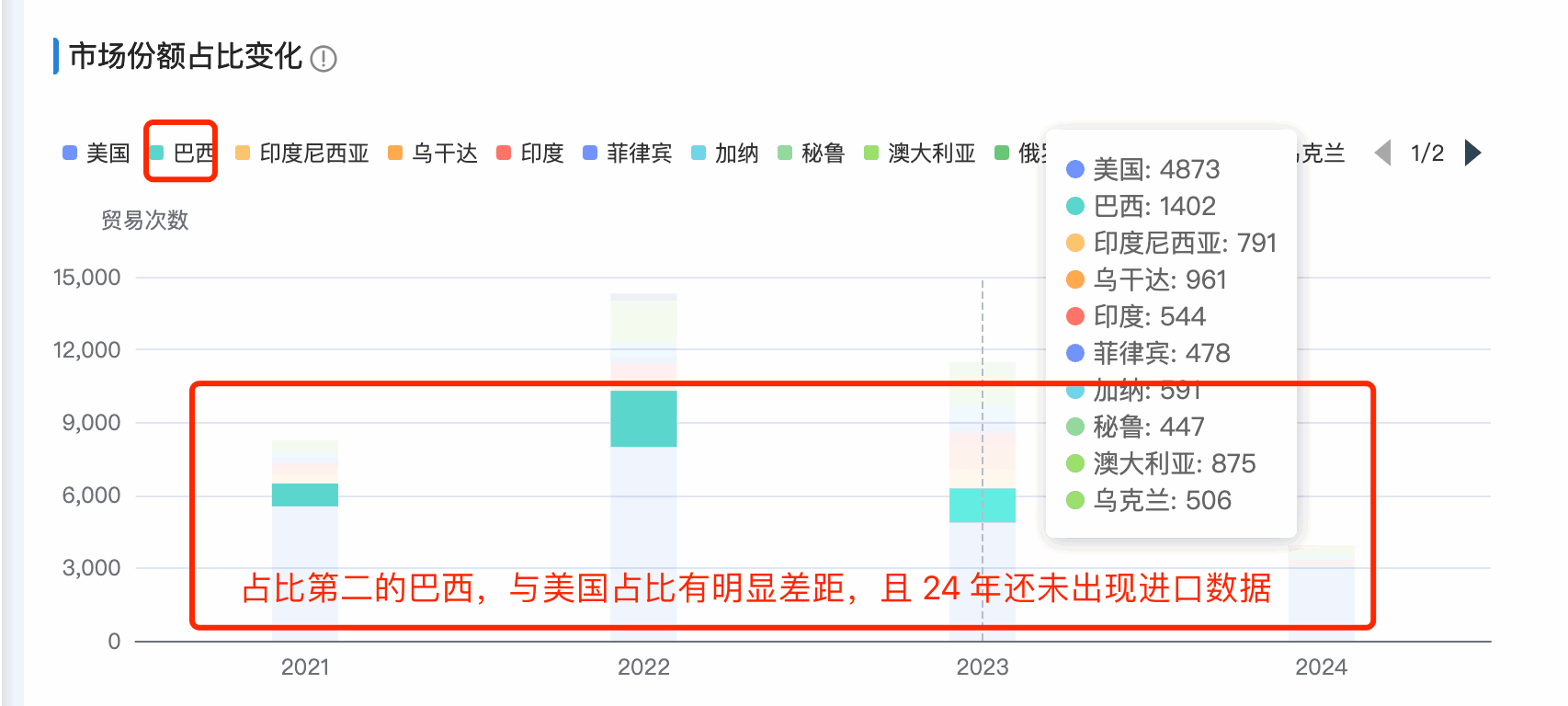 3. evo真人视讯商情洞察竞争分析新增「竞争集中度分析」:基于行业集中度(Concentration Ratio)理论来计算目标产品竞企竞争集中度,出口目标产品前8家最大的企业所占市场份额的总和,是对整个竞争市场结构集中程度的测量指标