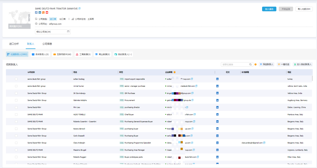 不用费时费力多渠道查找,evo真人视讯外贸通集合关键决策人的职务、邮箱、领英、Facebook等信息,可直接链接领英等世界主流社交媒体平台,帮助企业快速和目标对象建立联系,助力客户开发。